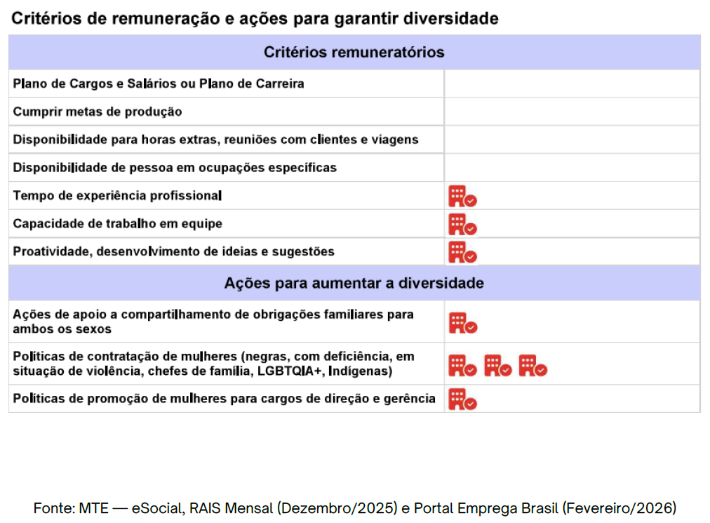 O quadro final do documento evidencia os pilares das nossas políticas de Recursos Humanos e inclusão. Ele confirma que a nossa remuneração valoriza aspectos como tempo de experiência, colaboração em equipe e proatividade. Mais importante ainda, o relatório comprova a existência das nossas ações afirmativas contínuas para impulsionar a diversidade, destacando o apoio às obrigações familiares, as políticas de promoção de mulheres para a liderança e a contratação focada na pluralidade feminina em todas as suas frentes.