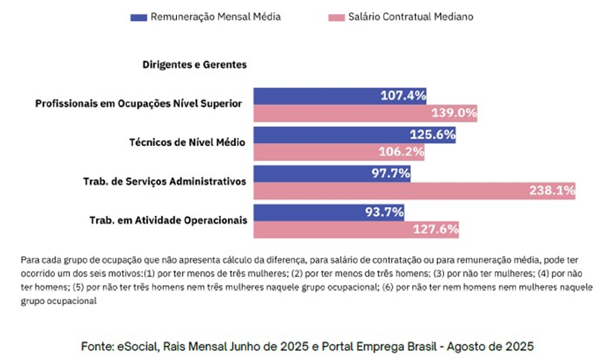 O relatório também apresenta a análise de remuneração dentro de diferentes grupos ocupacionais do mercado de trabalho, considerando tanto remuneração mensal média quanto salário contratual mediano. Os valores refletem a proporção entre remuneração feminina e masculina.