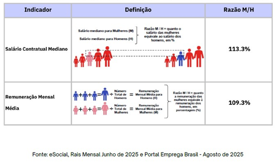 - O salário contratual mediano das mulheres equivale a 113,3% do recebido pelos homens